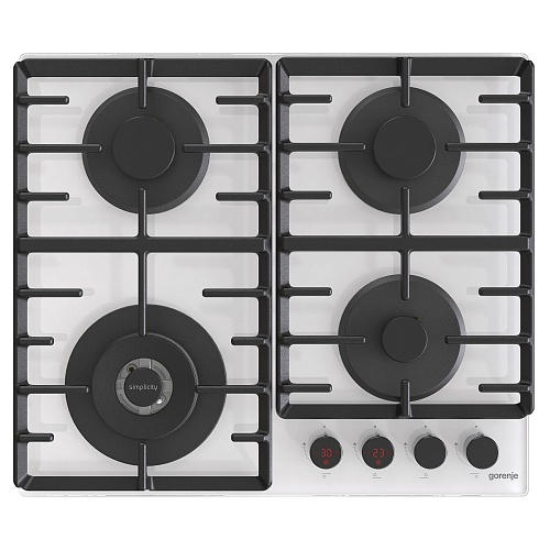 Поверхность газовая Gorenje GKTW642SYW (Simplicity 2.1 / Белое стекло / 4 конфорки / Чугунные решетки / Электроподжиг / Таймер)